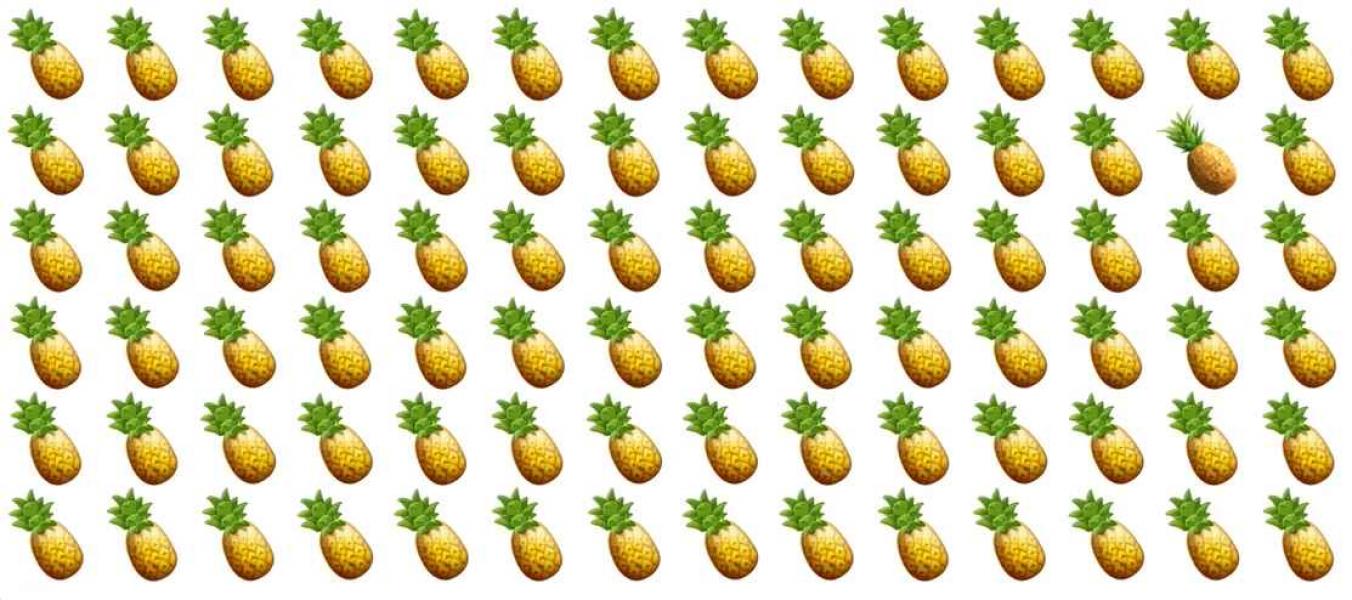 تصویر تعداد زیادی آناناس را نشان می دهد، آنها در چندین ردیف به تصویر کشیده شده اند. وظیفه شما این است که یک آناناس خاص را پیدا کنید که با بقیه متفاوت باشد.
