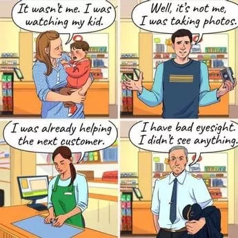 تصویر بالا چهار نفر را نشان می دهد که تنها یکی از آنها در مورد عذر خود دروغ می گوید. اول، مادر همراه با کودک میگوید که نمیتوانست کیف پول را بردارد زیرا «کودک را تماشا میکرد» و مردی که دوربین داشت ادعا میکند که او نبوده زیرا «عکس میگرفت».