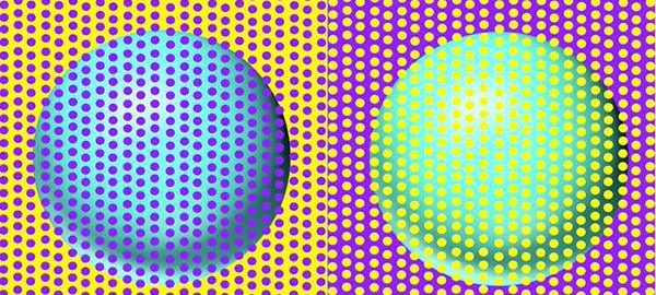 توپ ها متفاوت به نظر می رسند زیرا توپ سمت چپ با نقاط بنفش در پس زمینه زرد احاطه شده است، در حالی که توپ سمت راست با نقاط زرد در زمینه بنفش احاطه شده است.