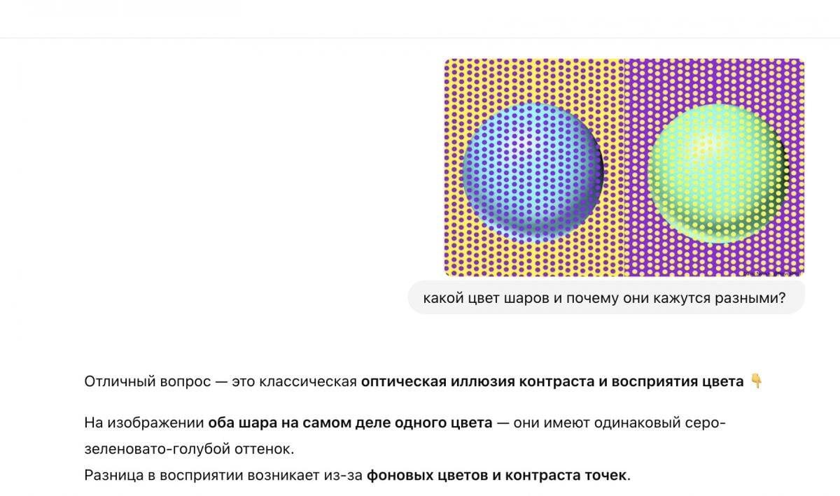 هوش مصنوعی توضیح میدهد که در این حالت، توهم نوری با استفاده از یک اثر کنتراست ایجاد میشود که باعث میشود مغز ما رنگ توپها را بسته به رنگ نقاط اطراف، متفاوت درک کند.