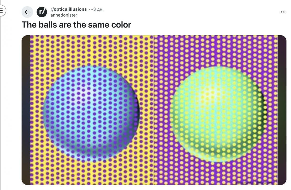 تصویر به صورت عمودی به دو نیمه تقسیم شده است: نیمه سمت چپ یک توپ آبی را در پس زمینه زرد نشان می دهد که با طرحی از نقاط بنفش پوشیده شده است. در نیمه سمت راست یک توپ سبز رنگ در زمینه بنفش با الگوی نقاط زرد وجود دارد. عنوان پست بیان می کند که توپ ها در واقع یک رنگ هستند.